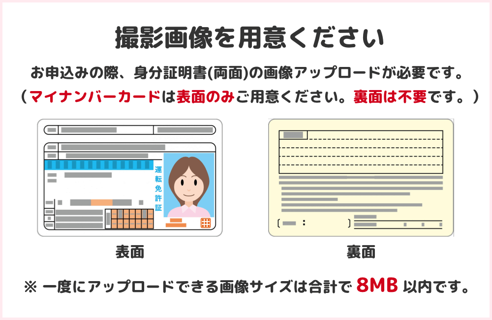 お申込みの際、身分証明証(両面)の画像アップロードが必要です。